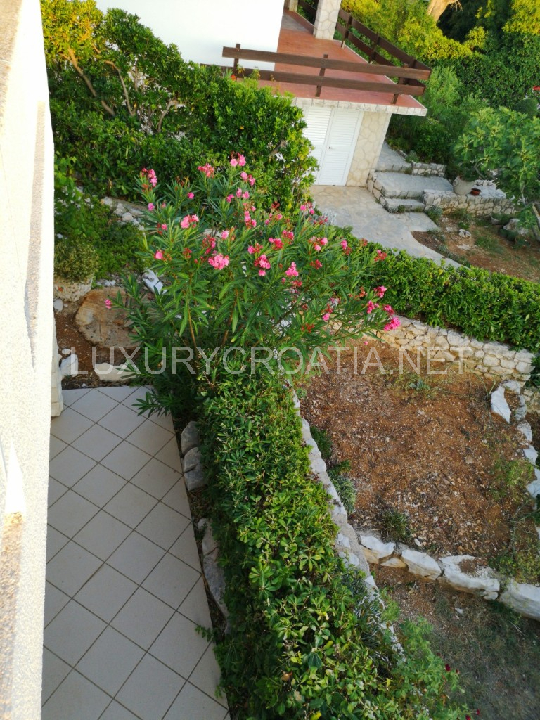 The lower residential unit (bathroom with toilet, bedroom and living room with kitchen) has a large semicircular terrace bordered by a wall of natural stone, covered with a wooden pergola, surrounded by fragrant greenery, which makes it a pleasant place for a whole day’s stay as an extension of the interior. The living room opens to the south through large double French doors through which the sounds and smells of the sea enter. On the same level is a large storage room for bicycles, garden tools, deck chairs and other equipment.