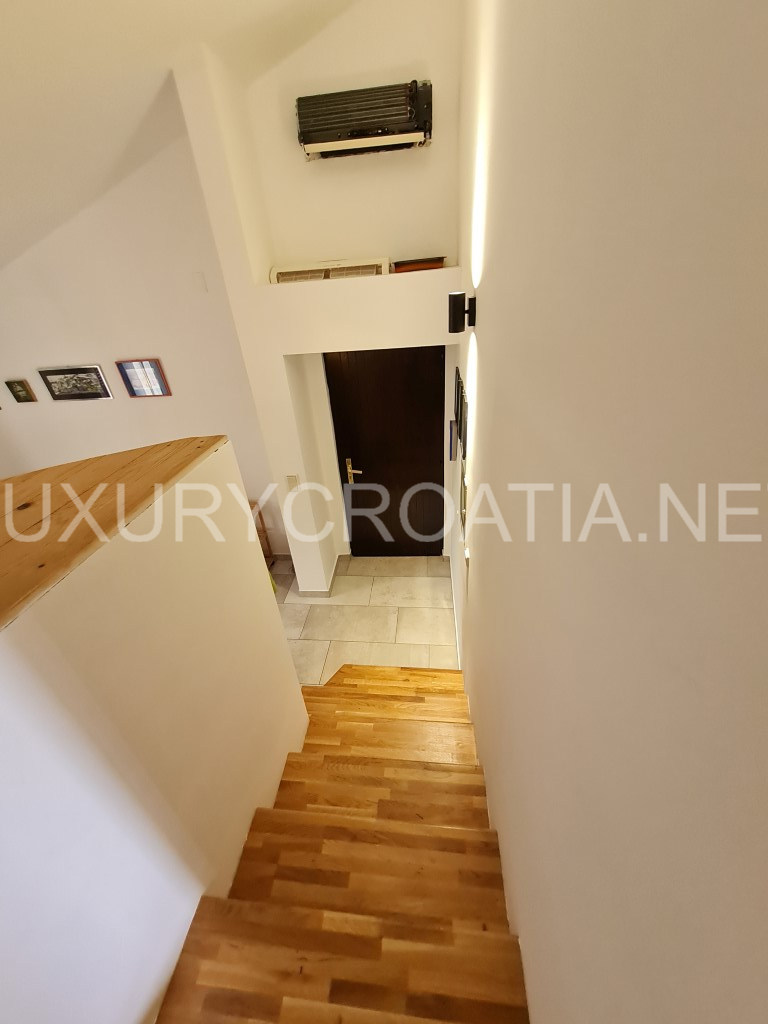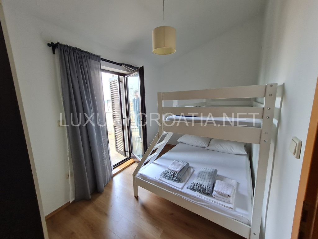 Front side apartment has 50 m2, underfloor heating, 2 bedrooms, front terrace, bathroom with washing machine, fully equipped kitchen and dining area. Back side apartment has 80m2 and is laid on two levels.